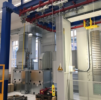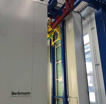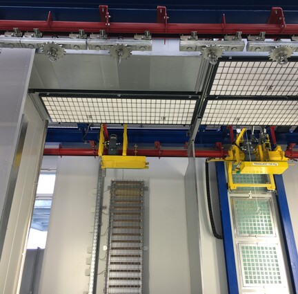 Die Aufnahme der Werkstücke in stehender Form wurde über eine Hub-Senkstation in der Fördertechnik realisiert. Werden die Werkstücke waagrecht angeliefert, so werden sie mit der Hub-Senkstation in eine senkrechte Lage gezogen. Eine Aufrichtfunktion kann für die Werkstücke über die Adapter erfolgen. Die Positionierung des Gehängewagens zur Nasslackierung erfolgt manuell und wird in der Lackierposition arretiert.