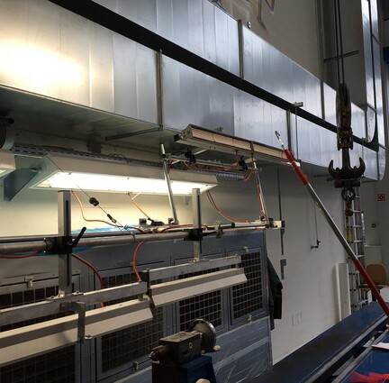 Lackiert wird an der Drehbank. Die Isolatoren, welche bis zu 8m lang sind, werden mittels Krans in eine Drehbank gehoben und entsprechend fixiert.